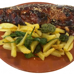 Costillas con salsa BBQ, patatas fritas con pimientos de padrón y aceite verde.